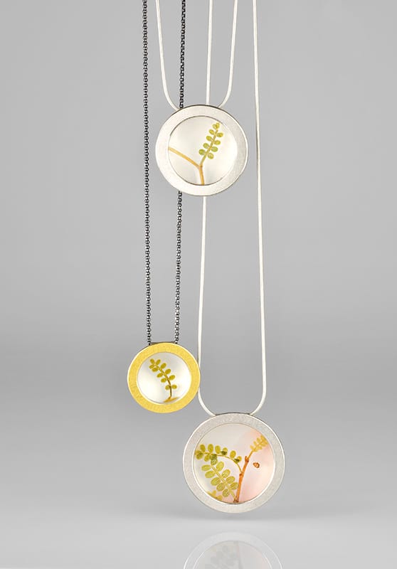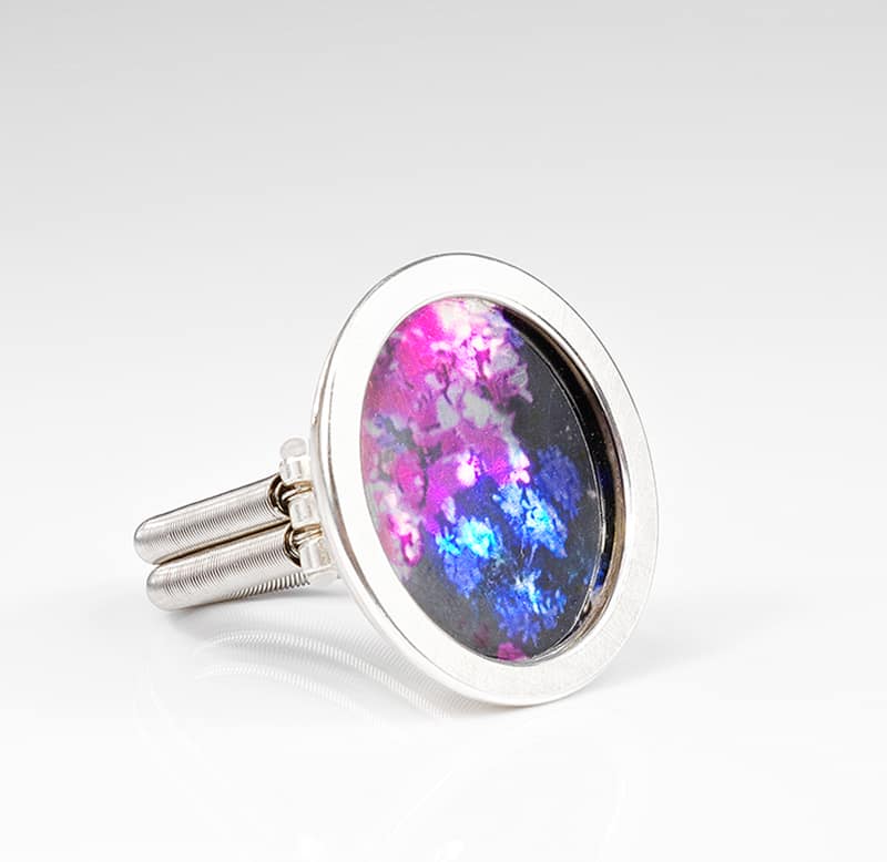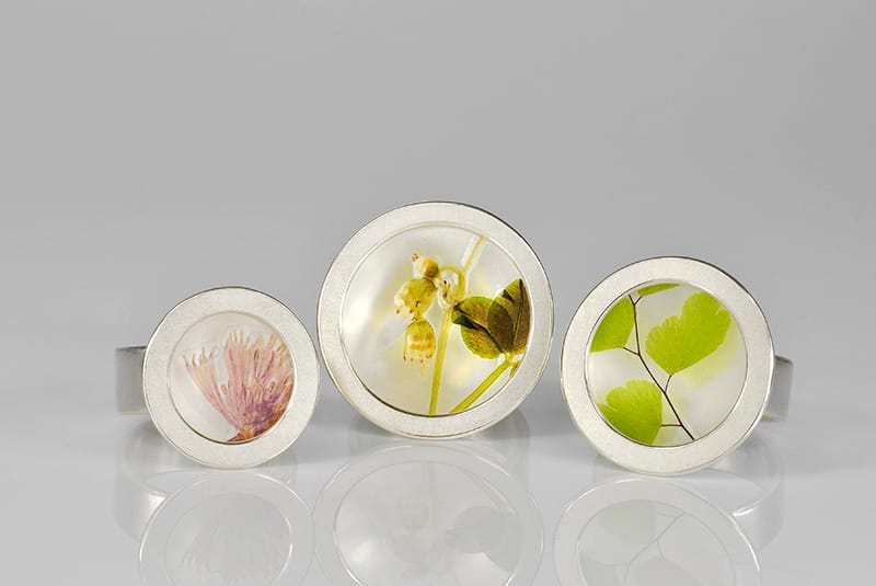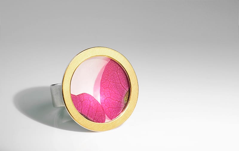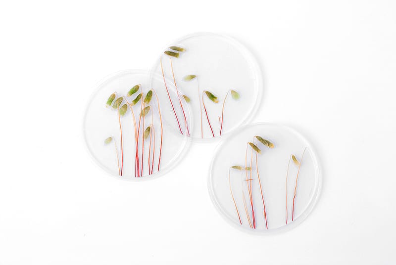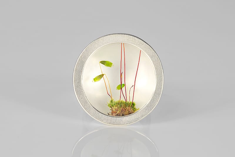 Manuell werden die unterschiedlichsten Blüten, Beikräuter und Moose getrocknet, gepresst und zu Inlays für die verwandelbare Schmuck Kollektion verarbeitet. Es enstehen immer kleine Kunstwerke aus der Natur. Ein schönes Beispiel hierfür ist das purpurstielige Hornzahnmoos.