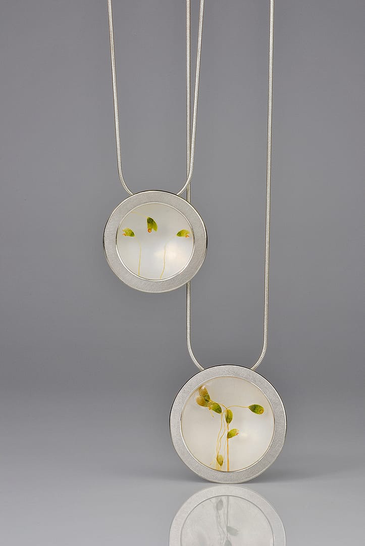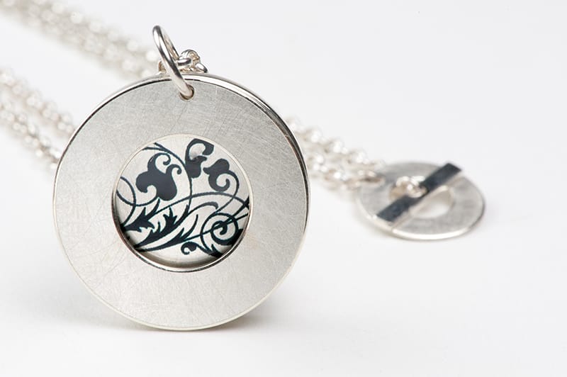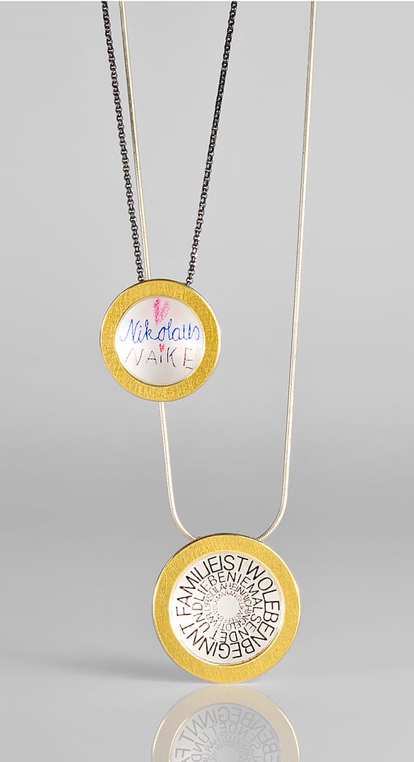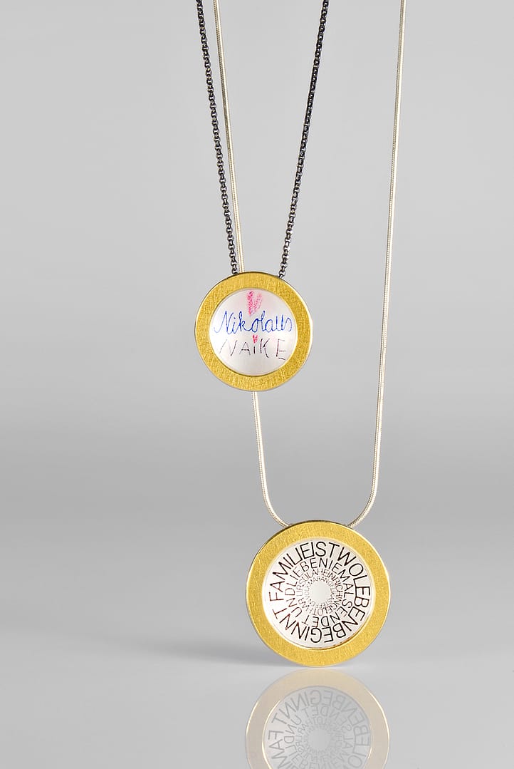 Verwandelbares, flaches Medaillon, in das ebenfalls alle denkbaren Motive eingesetzt werden können.Dieses Medaillon wird auf Wunsch mit einem längenverstellbaren Kettensystem angefertigt oder als kürzere Variante mit einem schönem Knebelverschluss. Größe des Medaillons: Ø 29 mm. Preis: 390 €