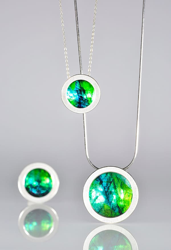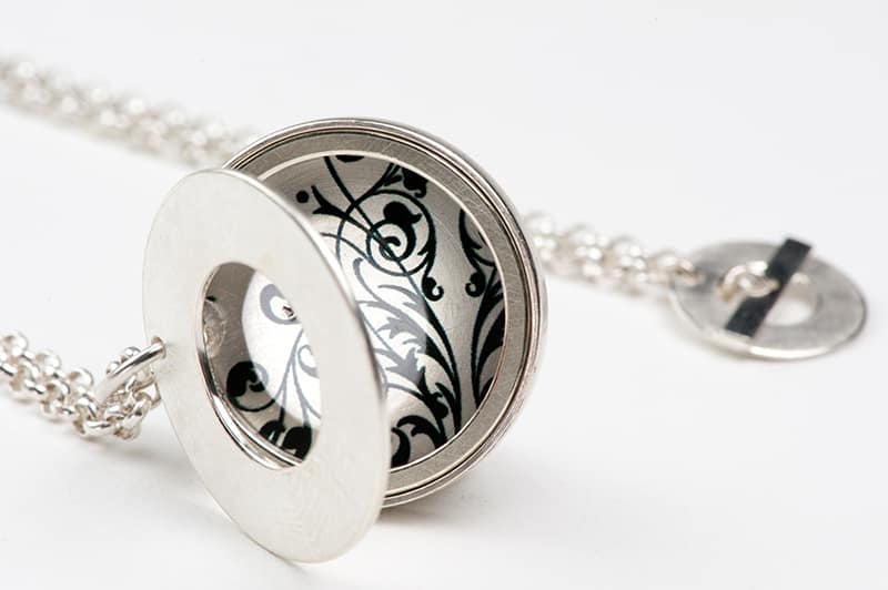 Dann wählen Sie die hochglanzpolierte, verspiegelte Schale der Ringe und Medaillons. Sie verleiht dem Schmuckstück eine diffuse, außergewöhnlich strahlende Tiefenwirkung.