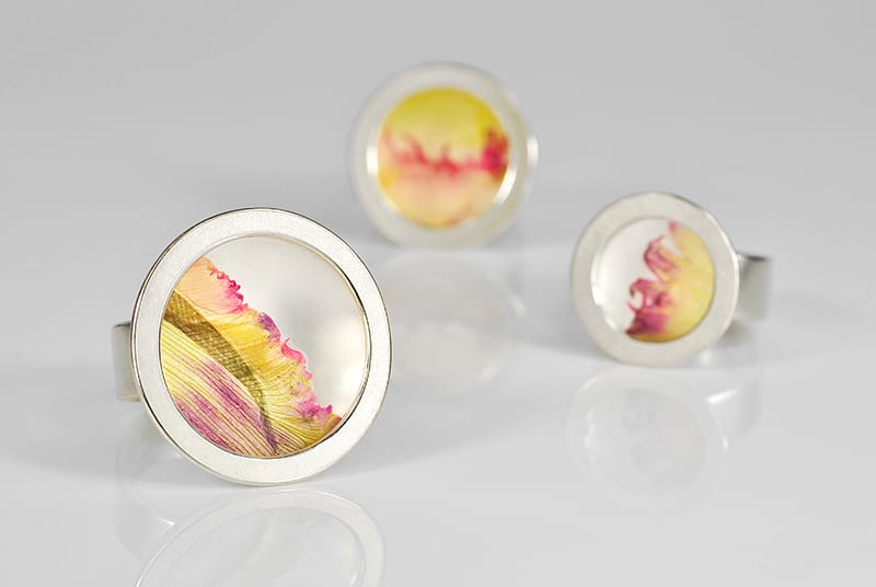Viele kleine Arbeitsschritte, die Zeit, Erfahrung und handwerkliches Feingefühl erfordern, werden benötigt, um die Ringschale dieser Schmuckstücke anzufertigen.